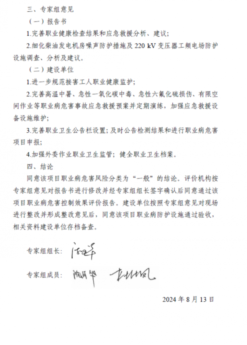 評價結(jié)論:根據(jù)對本項目現(xiàn)場調(diào)查、職業(yè)病危害因素檢測結(jié)果和項目相關(guān)資料的綜合分析,本項目當前(試運行階段)基本符合國家和地方對職業(yè)病防治方面法律、法規(guī)、標準的要求,本項目已具備職業(yè)病防護設(shè)施竣工驗收的條件。在生產(chǎn)狀況正常,職業(yè)病危害防護設(shè)施運行有效,工人佩戴合理有效的個體防護用品,其實際接觸的職業(yè)病危害因素的濃度/強度能夠控制在職業(yè)接觸限值內(nèi),且采取了控制效果評價報告所提對策措施和建議的情況下,符合國家和地方對職業(yè)病防治方面法律、法規(guī)、標準的要求。 建議: 1.1職業(yè)衛(wèi)生管理 1、該項目應(yīng)定期委托有資質(zhì)的檢測機構(gòu)對工作場所內(nèi)職業(yè)病危害因素進行一次定期檢測,并對每次職業(yè)病危害因素檢測結(jié)果公示。 2、用人單位外委具有職業(yè)病危害的作業(yè)時,應(yīng)書面告知給承包商工作場所存在的職業(yè)病危害以及相關(guān)要求,并采取措施達到防護條件,或配備個人職業(yè)病防護用品。 3、定期對在崗期間的勞動者進行職業(yè)衛(wèi)生培訓(xùn),根據(jù)實際情況制定培訓(xùn)計劃,確定培訓(xùn)周期。做好記錄及存檔工作。 4、本項目竣工驗收后,建設(shè)單位應(yīng)按照本報告書識別的職業(yè)病危害因素進行申報。 5、該用人單位在作業(yè)場所設(shè)置了完善的警示標識,今后每半年至少應(yīng)對其進行一次檢查,發(fā)現(xiàn)有破損、脫落、褪色、變形等不符合要求時,應(yīng)按照《工作場所職業(yè)病危害警示標識》(GBZ158-2003)相關(guān)規(guī)定進行修整更換。 1.2個人防護用品 用人單位應(yīng)當進一步完善個人防護用品的發(fā)放周期及使用監(jiān)管內(nèi)容,加強作業(yè)人員防護用品佩戴監(jiān)督,定期更換防護用品。 1.3職業(yè)健康監(jiān)護 該項目生產(chǎn)作業(yè)人員體檢因素還需進一步完善,將視屏作業(yè)納入職業(yè)健康體檢范疇。建議建設(shè)單位按照《職業(yè)健康監(jiān)護技術(shù)規(guī)范》(GBZ188-2014)相關(guān)規(guī)定,組織接觸職業(yè)病危害因素的作業(yè)人員到具有職業(yè)健康體檢資質(zhì)的醫(yī)院進行在崗期間職業(yè)健康體檢,對新進員工進行崗前體檢,對離崗人員進行離崗體檢。 建設(shè)單位應(yīng)按《中華人民共和國職業(yè)病防治法》中華人民共和國主席令〔2018〕第24號和《職業(yè)健康監(jiān)護技術(shù)規(guī)范》(GBZ188-2014)相關(guān)規(guī)定全面履行職業(yè)健康監(jiān)護工作,對新進作業(yè)人員進行崗前體檢、并對離崗或調(diào)離作業(yè)人員進行離崗健康檢查,根據(jù)體檢結(jié)果對作業(yè)人員按照《職業(yè)病防治法》等法律法規(guī)進行合理處置。 1.4外包作業(yè)建議 1、督促外包單位安排本項目維護檢修人員完善職業(yè)健康體檢項目。 2、對外包單位維護檢修作業(yè)勞動過程中職業(yè)病防護設(shè)施使用情況和個人防護用品佩戴進行監(jiān)督。 1.5應(yīng)急救援建議 該項目存在六氟化硫急性中毒、職業(yè)中暑、一氧化碳急性中毒,建議建設(shè)單位進行六氟化硫急性中毒、一氧化碳急性中毒、職業(yè)中暑應(yīng)急演練并加強應(yīng)急救援防護。