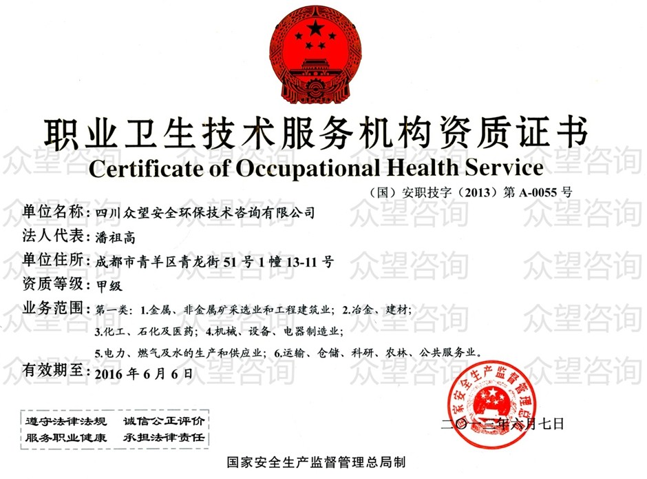四川眾望自2010年取得職業(yè)衛(wèi)生技術服務機構乙級資質起即開始從事職業(yè)衛(wèi)生服務工作,于2013年6月7日取得職業(yè)衛(wèi)生技術服務機構甲級資質。在秉承“責任 規(guī)范 誠信 真相”的工作準則下,眾望迄今已順利完成1300余項建設項目職業(yè)病危害因素日常檢測、職業(yè)病危害預評價、職業(yè)病危害控制效果評價及職業(yè)病危害現(xiàn)狀評價。